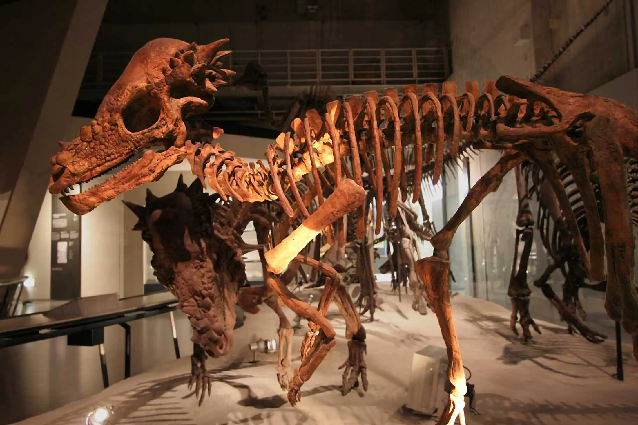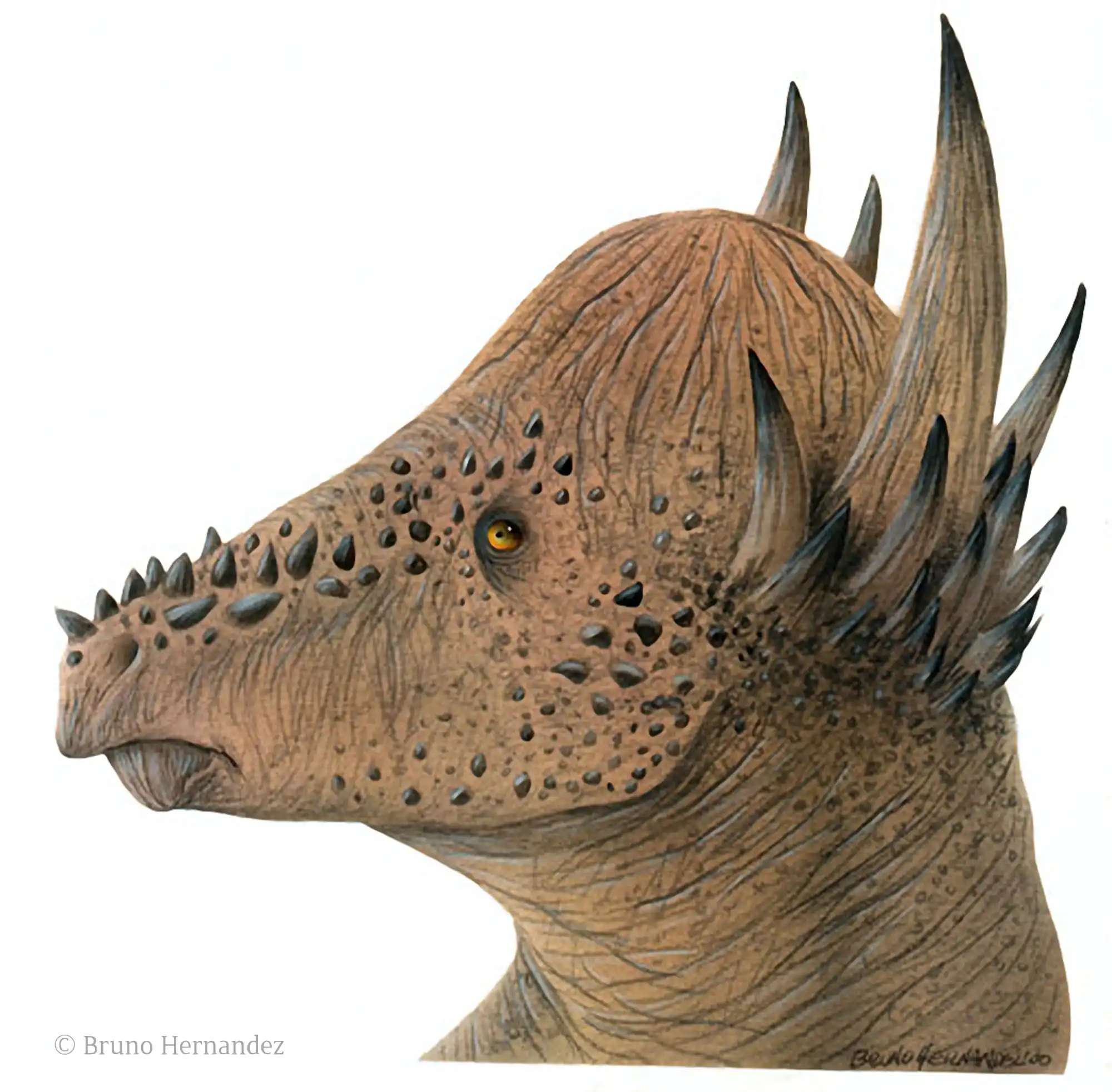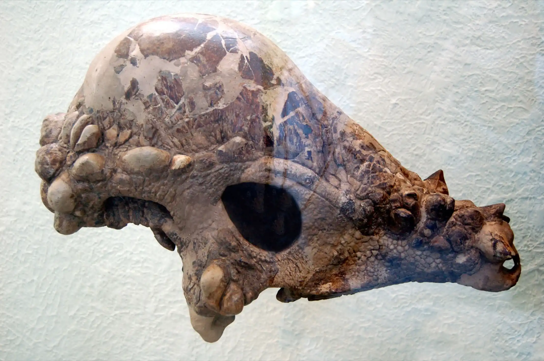 Dies war ein wirklicher Dickkopf. Das Schädeldach von Pachycephalosaurus war 20 cm stark. Dieser pflanzenfressende Dinosaurier lebte während der späten Kreidezeit im heutigen Nordamerika. Pachycephalosaurus ist nur von einem einzigen Schädel bekannt, daher kann über die Anatomie und Größe des Pachycephalosaurus nur spekuliert werden. Pachycephalosaurus besaß unterschiedliche Zahnarten, die Zähne waren klein und besaßen dreieckige, leicht gezackte Kronen.