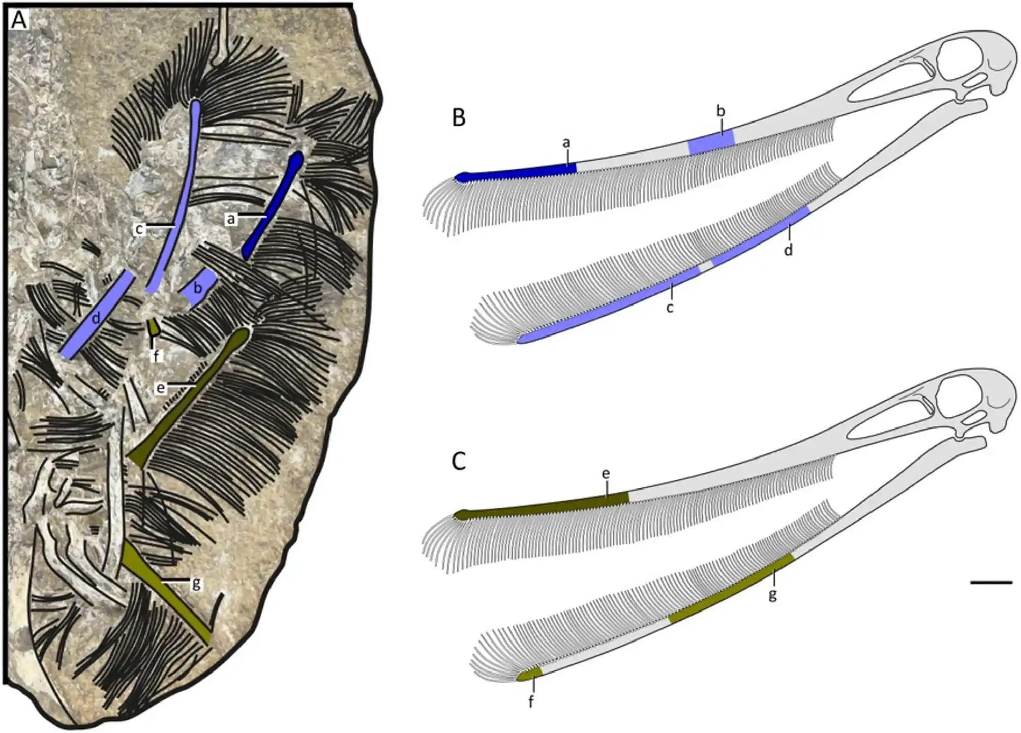 Die vierte Kieferspitze (Fragment f) ist ein kleineres, weniger gut erhaltenes Fragment. Die Forscher interpretieren daher die größeren Spitzen (a und e) als Oberkiefer und die weniger ausgedehnten Spitzen (c und f) als Unterkiefer, basierend auf den Proportionen bei Ctenochasma elegans SMNS 81803, wo die Oberkieferspitze etwas stärker ausgedehnt ist als die Unterkieferspitze. Aufgrund ihrer nahen Lage und ähnlichen Orientierung gehen die Forscher vorläufig davon aus, dass die Fragmente a und b zu einem einzigen Individuum gehören (als Holotyp gewählt). Fragment e, das eine zweite Oberkieferspitze (und somit ein zweites Individuum) darstellt, wurde als Paratypus gewählt. Fragment f wird vorläufig demselben Individuum wie Fragment e zugeordnet.